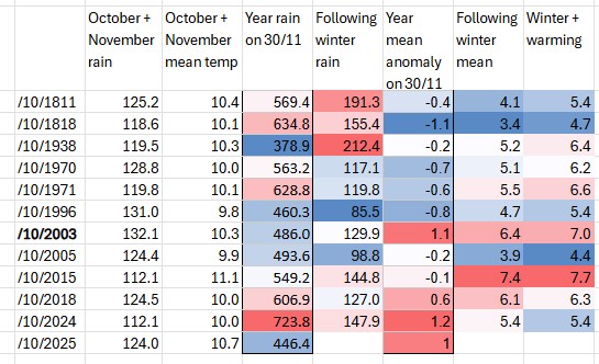In terms of rainfall and mean temperature a total of eleven years were similar to this October and November, spanning 1826 to 2021.