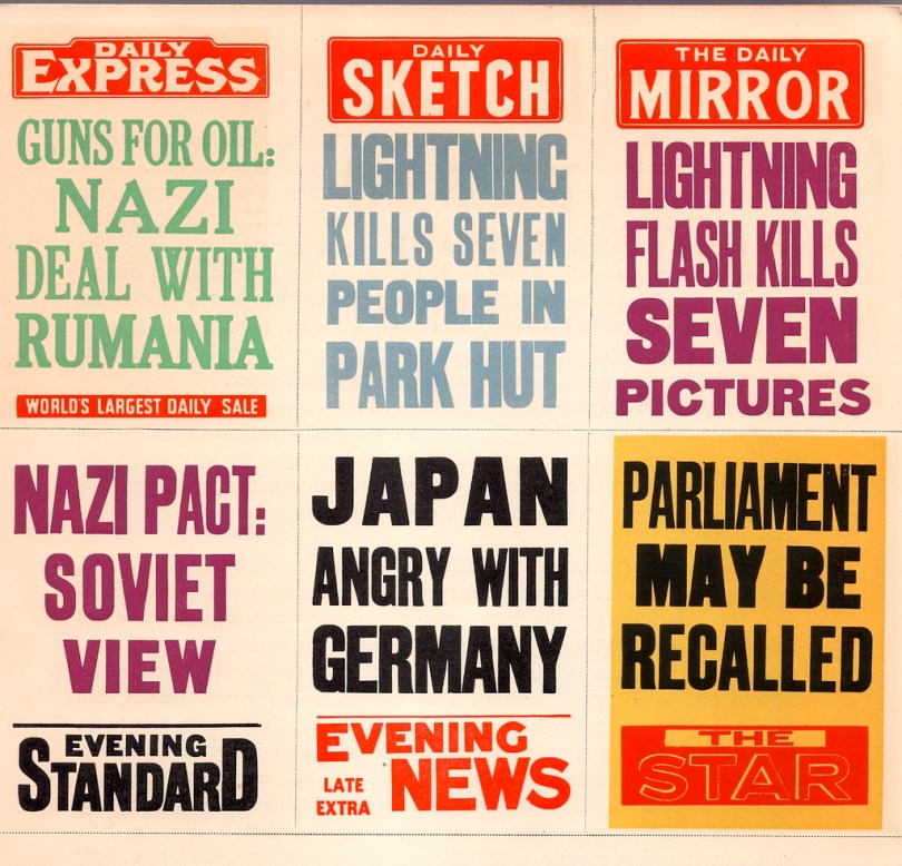 This selection of newspaper bills, produced by Mike Ashworth, shows a media fixated with build up to the start of WW2 while the Daily Sketch and Daily Mirror focused coverage on the horrifying event in Ilford