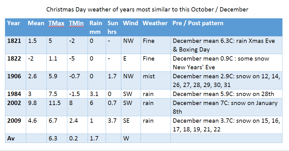 I firstly had a look at Christmas Day stats overall since 1840. The most common group of maxima in the series is 8.1C and above. This occurred 69 times or 40%. I then had a look at the years that most closely follow this October and November. None of the years saw a white Christmas, however it is interesting to note that five out of the six years saw some snow during the month. Snow often falls before and after Christmas. Why that is no-one knows.