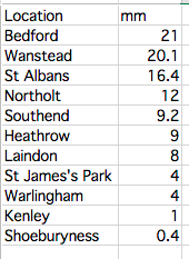 At 00:19pm occurred the brightest flash of lightning almost instantly followed by a very loud crack of thunder, the kind you hear on those Hammer Horror films with Peter Cushing. Looking at the rainfall of weather stations around the south-east it appears that Wanstead was in the thick of the action, clocking up 20.1mm of rain and second only to Bedford. The amount represents 47% of what normally falls in an average July. As always in these situations some places get a deluge while others remain almost dry.