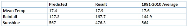 In terms of temperature my predicted figure of 17.4C was 0.5C lower than the result. My rainfall prediction was only 76% of what actually fell and I over-estimated sunshine by 16%.