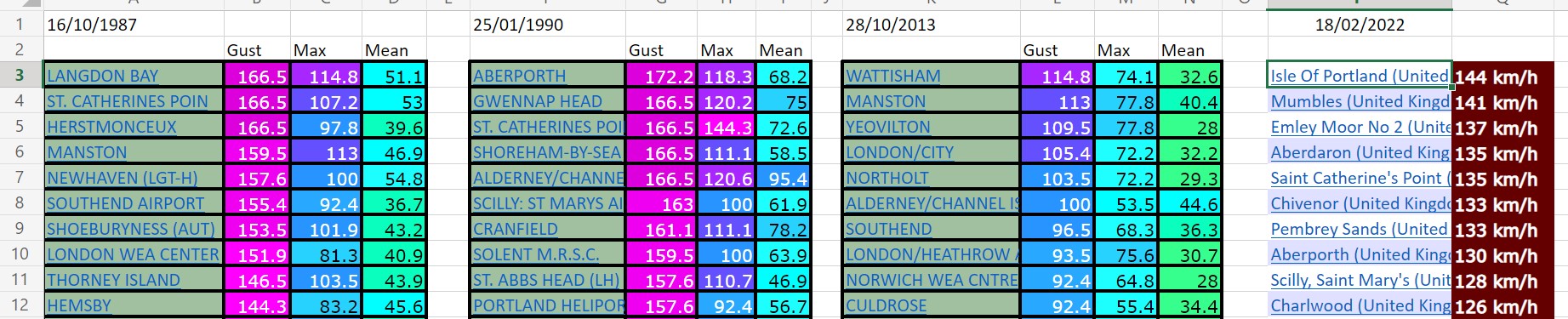 The ‘perfect hurricane’ was referring to the Beaufort Scale which had been written just over a decade before in 1805. Obviously anemometers were not around at the time – the scale was merely to describe sea conditions to help sailors. A modern interpretation of hurricane force 12 estimates mean speeds 72 – 83mph.