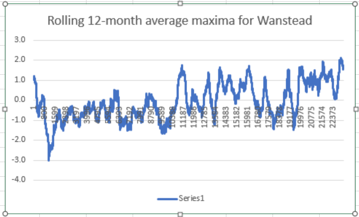 The rolling 12-month average maxima anomaly in Wanstead on June 10th is sitting at 1.6C.