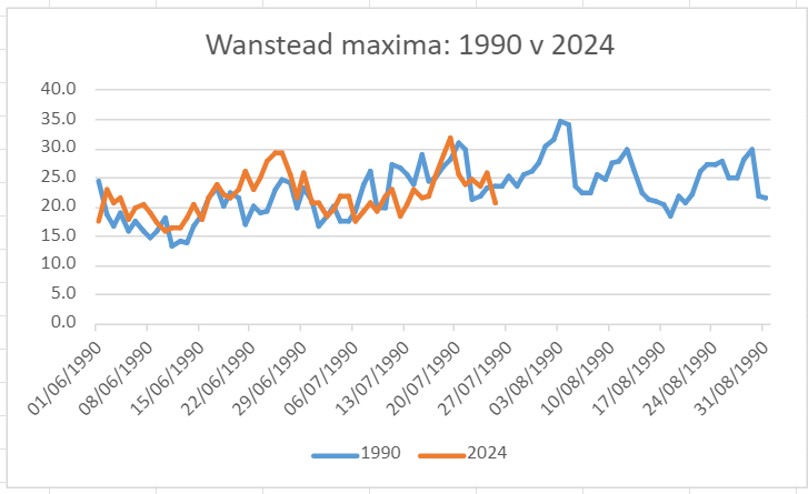 It is the minima that produces the most notable results with average low temperatures increasing over 2C from 15.9C to 18C! The urban heat island in full effect although the estate where a large proportion of these stats are gathered has changed little since it was built in the early 1900s.
