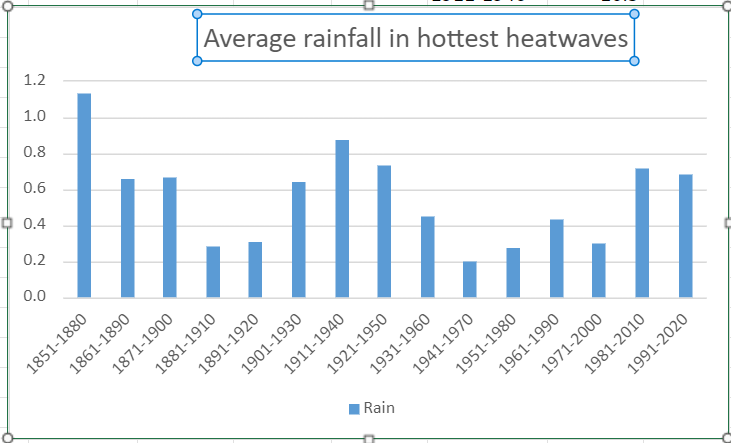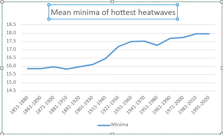 The mean of these hot spells has increased from 24.2C in 1851-1880 to 24.9 in 1991-2020, an increase of 0.7C.