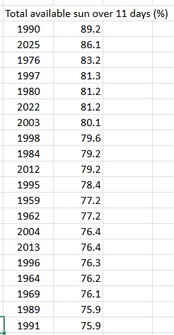 In terms of the total percentage possible of sun hours the past 11 days are second only to a period in 1990 that stretched from April 27th until May 7th.