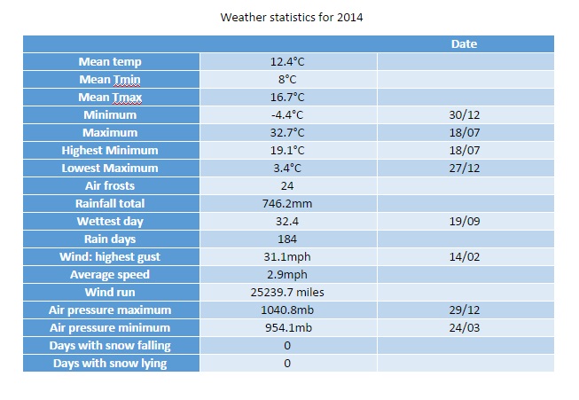 Every month of 2014, apart from August and December, was warmer than average – the means being over 1C warmer every month, bringing the mean temperature to 12.4C, just 0.4C short of the warmest year in 2011 and 1.2C warmer than the 1981-2010 average.
