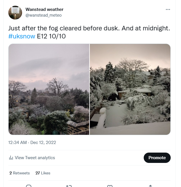The morning of December 11, 2022, began cold after an overnight frost that saw temperatures fall to -5.3C. Freezing fog lasted through the day, coating everything in rime to set the stage for what was to be one of the most notable snowfalls in years.
