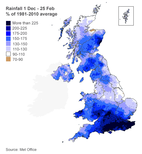 The series makes for interesting reading, putting this winter as 6th wettest since 1797. Scientists would say that because my series is only one dataset it cannot be regarded as a ‘catch-all’ for the country overall. But when statements like “England and Wales has had its heaviest rainfall since 1766” are put out by the media it is blatantly not true for the entire country. Just a quick look at the map shows that while parts of south and southeast England have been very wet – other parts of the country have been much less so.