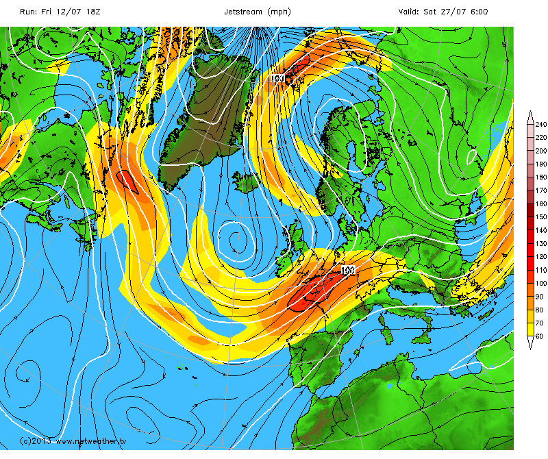 In meterological terms the position of the frontal zone around the end of June to early July, indicated by the position of the jet stream, determines the general weather patterns (hot, cold, dry, wet) for the rest of the summer. Like a little stream in its bed, the frontal zone tends to ‘dig in’ shortly after the summer solstice.