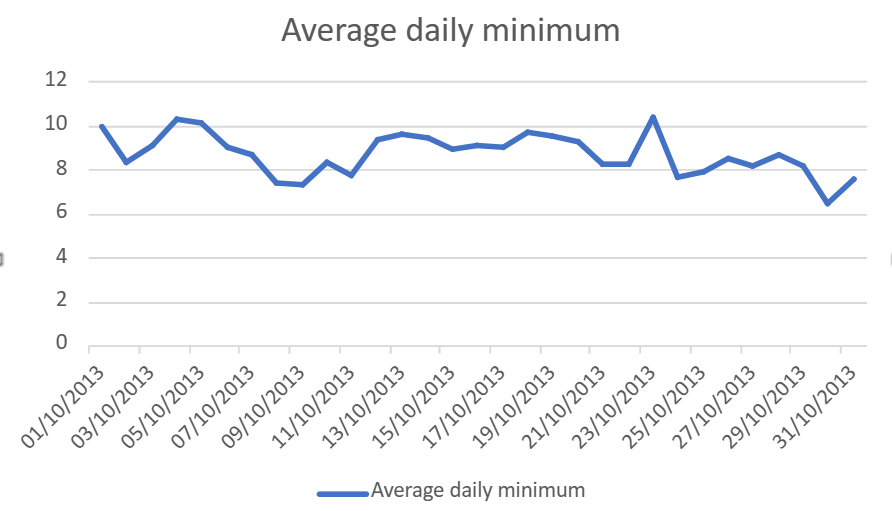 Average daily minima is up and down in the first 10 days before a steady rise from the 11th. Again there’s that falling off a cliff on the 23rd.
