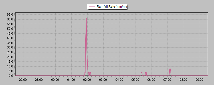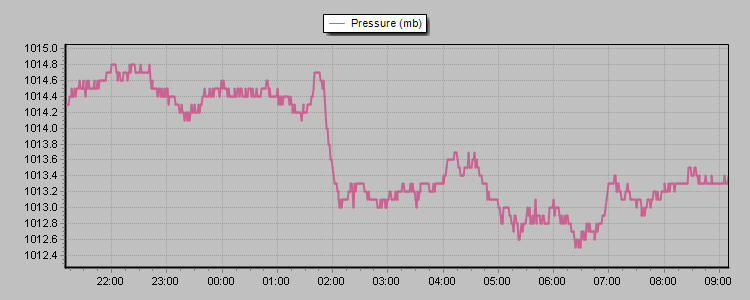 Earlier people all around town and across the country wilted in the heatwave waiting for news on the royal sprog, many of them ignorant that things were about to go bang. But no matter – it’s days like this they say is good to bury bad news – so the weather, it seems, decided to get in on the act too. The first spots of rain fell on an exhausted crack Sky News commentary team outside Buckingham Palace just before midnight. About the same time reports started coming in of thunder in Canning Town and Poplar – but all went quiet after three flashes. Then 11.58pm reports of rain in Luke Howard’s old haunt – Plaistow. My own ride back from town saw reasonably heavy, if somewhat shortlived, rain in Southwark. Yet by the time I reached Aldgate the ground was dry. Things began to liven up again at 1.30am – distant rumbles of thunder getting closer – further reports of multiple thunder, lightning and heavy rain with hail mixed in at 1.45am. Then, bang, the storm hit Wanstead. I failed to get any footage of the event because of the ambient light washing out every shot. Multiple crashes of loud thunder followed by, at one point, dazzling lightning flashes. You know how close a storm is by counting the seconds between lightning and peal of thunder. At 1.51am I barely counted to one between a dazzling flash and one of the loudest cracks of thunder I’ve heard. Only 6.5mm of rain was recorded, though this fell at a rate of 60mm/hr – the highest rate since I put the meteo live online last November. It doubled the previous highest rate! There followed frequent, distant rumblings of thunder to the east along with copious flashes and occasional bursts of rain. Epping recorded 19mm in two storms at 5am and 6.30am. The thunder and oppressive humidity made sleep difficult. And judging by the number of bleary eyes on the school run this morning I wasn’t alone. The were other storms around London and the UK – a notable one in Brixton precipitated this account on Brixton Buzz. And Steve Brice managed to capture the lightning in Gillingham, Kent. Pershore in Worcestershire recorded over 56mm of rain in 3 hours while lightning damaged rail networks. It was one of the most dazzling displays I can remember – certainly the best since probably 2000 if not before. People often ask me what first got me interested in the weather. Until last night I’d almost forgotten that thunderstorms were one of the main attractions. A night to remember – just like the overnight storms in the Eighties I remember as a lad. Scott Whitehead @wanstead_meteo http://www.wansteadweather.co.uk with thanks to @loveloughtonfor storm updates The following charts show the cell well. The 2mb pressure drop, the 60mm/hr rainfall rate, the 2C dive in temperature, and the sudden gust of wind This pressure drop is also reflected in the temperature fall at the same time: 2C in a matter of minutes.